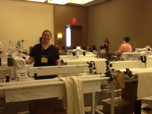 Another great day at MQS! Super class with Sharon Schamber! Always a great opportunity! Working on feather techniques after we turned one of the Handi Quilter machine heads around – the tech had installed it backwards (must be a newbie)
